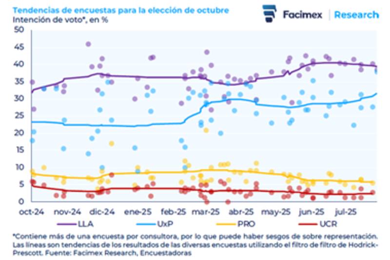 Al tomar los últimos datos de 10 encuestadoras que publicaron mediciones en el último mes y medio, 9 posicionaron en primer lugar a La Libertad Avanza y en segundo lugar a Fuerza Patria, mientras la encuesta restante se ubicó dentro del margen de error estadístico