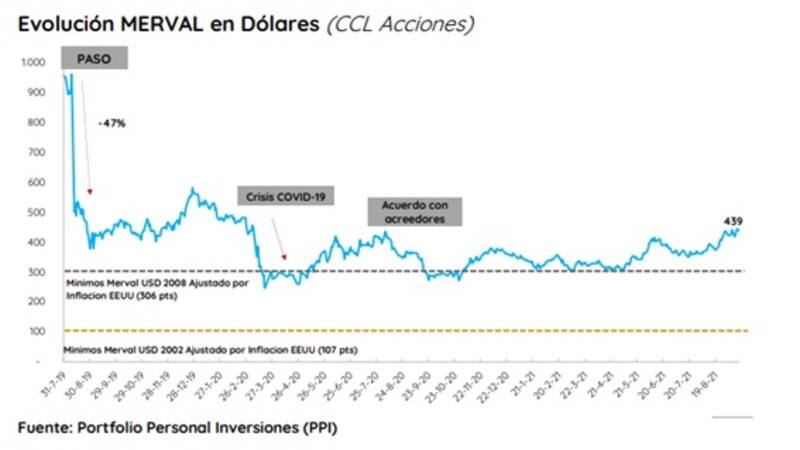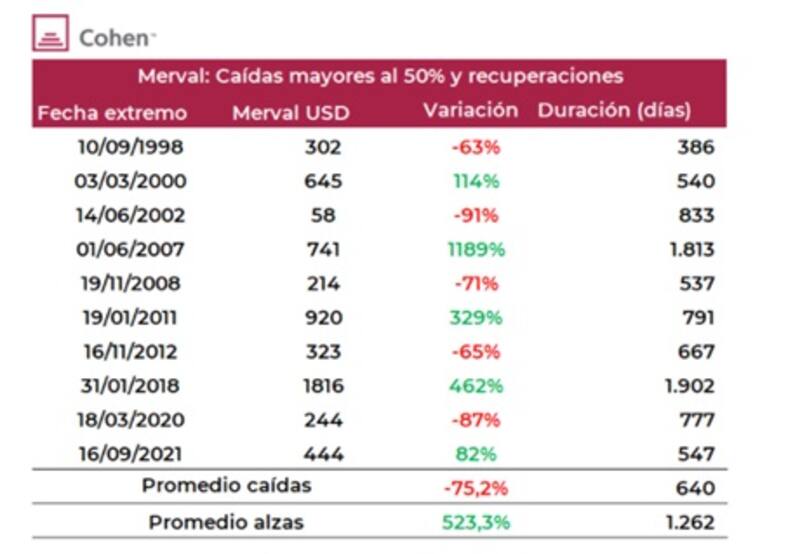 "El camino por recorrer continuará siendo volátil, aún queda pendiente un acuerdo con el FMI y encontrar solución a los desequilibrios macroeconómicos que impiden proyectar un crecimiento sostenido. No obstante, si la historia sirve de guía, luego de caídas superiores al 50% (el Merval cedió 87% entre 2018 y 2020) suelen registrarse recuperaciones prolongadas, que promedian un alza de 3 dígitos en USD y se extienden más de 3 años", dijeron desde Cohen.