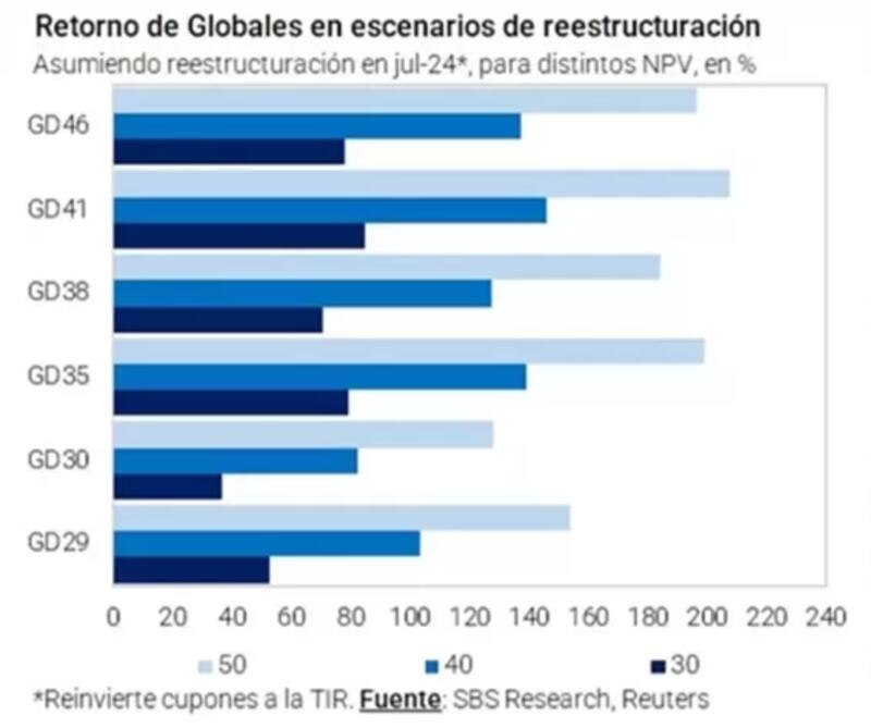 Si el Valor Presente Neto de los nuevos bonos a entregar de cara a una próxima reestructuración en 2024 fuera de u$s 40, las mayores ganancias se observarían en el Global 2035, con rendimientos de más de 155%, seguido del 145% y 140% que ofrecerían los Global 2041 y 2046, respectivamente.