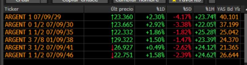 En el tramo medio se observan subas de 1,8% en el Global 2035 y de 1,5% en el Global 2041. Por su parte, los bonos más largos avanzan 0,55% en el Global 2041 y 1,6% en el caso del Global 2046.