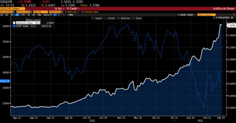 Esto se evidencia también en que las acciones, principalmente las tecnológicas, operan a la baja a medida que los rendimientos del tramo corto se desplazan al alza.