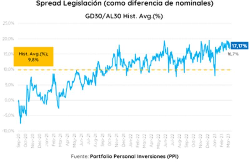 El mercado espera que a causa de ese ajuste más pronunciado en los bonos de ley local versus los de ley internacional, se produzca un aumento en el spread por legislación que se ubica en 17,2%, ubicándose en el tope más alto de la historia reciente.
