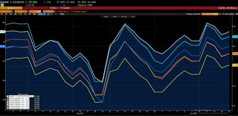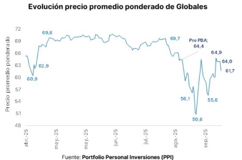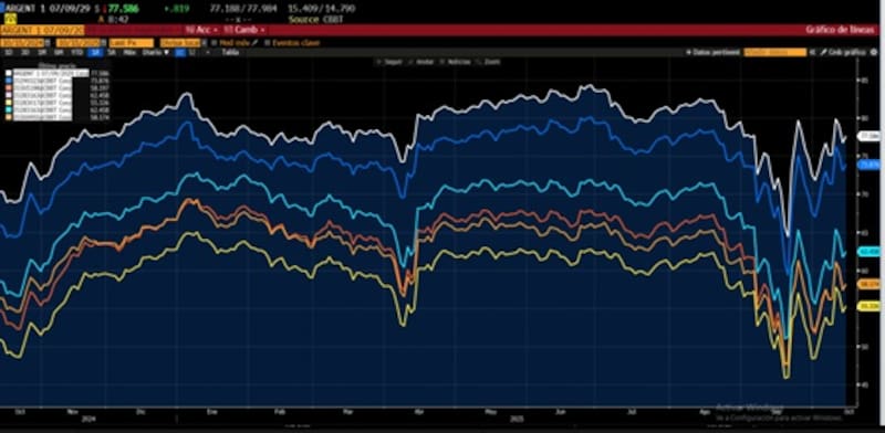 El Global 2029 sube 1,32%, mientras que el Global a 2030 avanza 0,79%. En el tramo medio de la curva se ven avances de 0,92% en el Global 2035 y de 1,11% en el Global 2038.