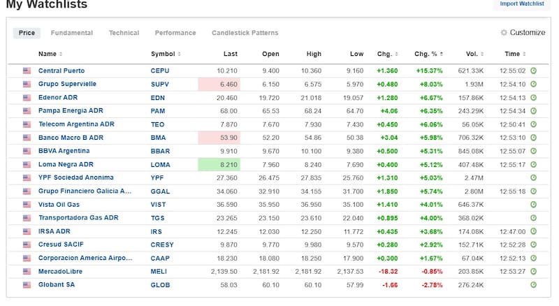 Por el lado de las acciones se ven fuertes subas como en Central Puerto, que gana casi 12%, seguida por Grupo Supervielle, avanzando 7,8%.