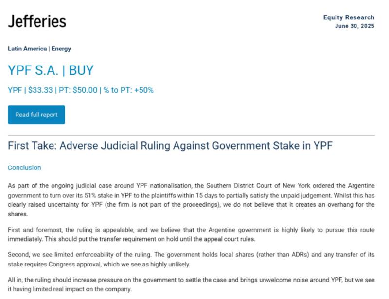 Pese a este panorama, el banco de inversión Jeffreries se mostró optimista con el futuro de la acción de YPF. "En primer lugar, el fallo es apelable y creemos que el gobierno argentino probablemente seguirá este camino de forma inmediata. Esto debería suspender la exigencia de transferencia hasta que la corte de apelaciones se pronuncie. En segundo lugar, vemos una capacidad limitada para hacer cumplir el fallo", dijeron.