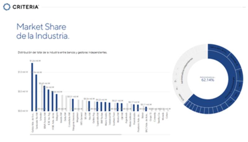 Las cinco gestoras bancarias que mayor share abarcan son Fondos Fima de Banco Galicia, con un 11,38% del total, seguido por Santander Asset Management (8,65%), BBVA Asset Management (6%), ICBC Investment Argentina (5,11%) y HSBC Administradora de Fondos con el 4,73%. Por su parte, las cinco gestoras independientes que mayor cantidad de activos gestionan se destacan Schroders con el 6,36% del total, Investis Argentina con el 3,82%, Delta (3,82%), Consultatio (3%) y Megainver con el 2,72%.