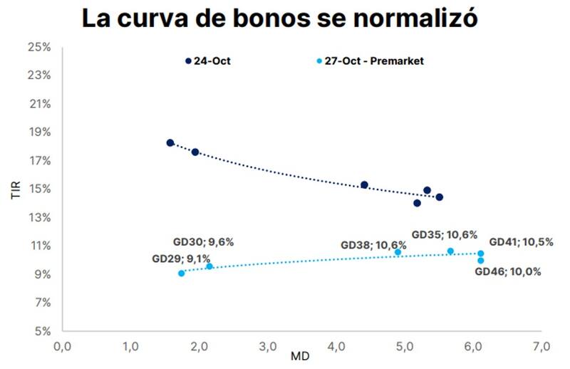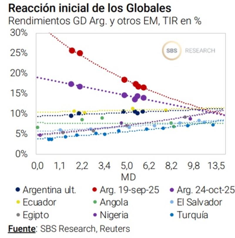 "En caso de igualar los rendimientos de aquellos países calificados como B y BB, el posicionamiento debería concentrarse en Globales como GD35 y GD41, con subas que rondarían 16% y 18% en el primer caso, y 35% y 39% en el segundo (con un tramo corto que se revalorizaría +12% en el mejor caso). Esto demuestra que todavía los bonos tienen recorrido al alza, aunque el mismo dependerá ahora no tanto del resultado electoral, si no de las medidas y anuncios económicos que se presenten en las próximas semanas", afirmó Meroi.