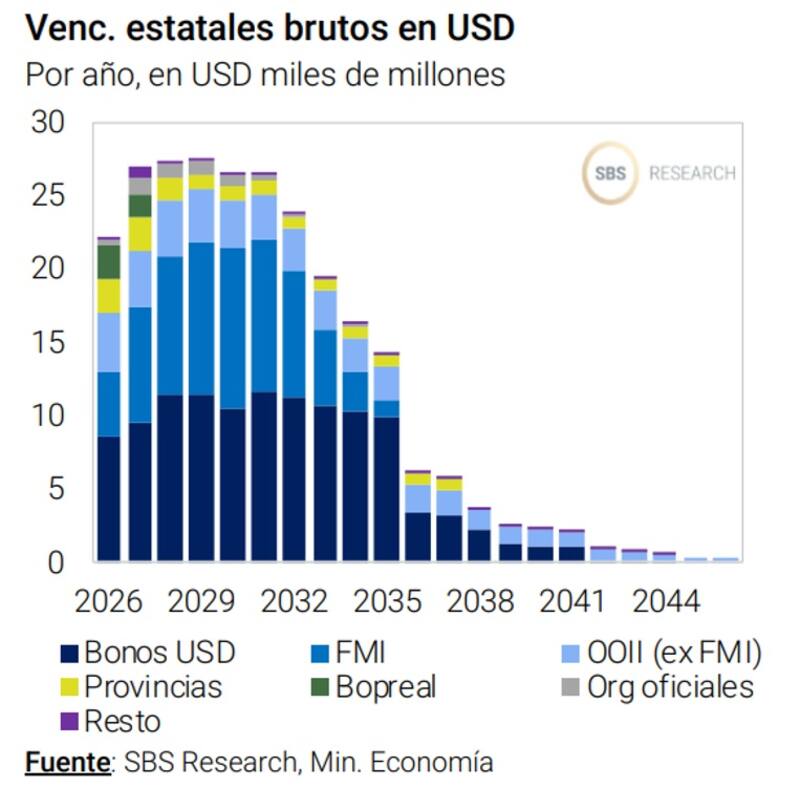 "Una potencial operación de pasivos en dólares de mercado de corto plazo (por ejemplo, vía operaciones con organismos internacionales de crédito como la "deuda por educación" destacada la semana pasada) podría ayudar dado que despejaría parte de los pagos de los próximos años, en especial en materia de amortizaciones de los bonos en dólares a 2029 y 2030", consideró Franco.