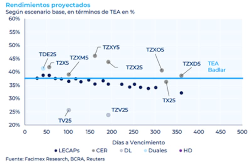 "En un escenario optimista, con un crawling peg del 1% mensual y una brecha del 5%, la Lecap a junio de 2025 (S30J5) podría rendir 18% en dólares, con un riesgo país break-even de 500 puntos básicos. Este nivel, coherente con mayor estabilidad cambiaria y desinflación, acercaría el riesgo país de Argentina al promedio de la región", indicaron.