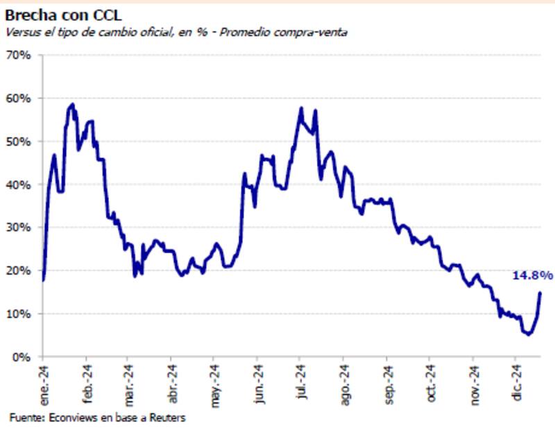 "Si la brecha se mantiene firme, una Lecap a 30 días ofrecerá un rendimiento mensual en dólares de 0,9%. Anualizado, este retorno equivale a TNA 11% anual, algo muy similar a lo que pagan los bonos del Tesoro y del Banco Central. Sin embargo, si la brecha aumenta en cinco puntos porcentuales al 17%, el retorno de esta inversión podría transformarse en una pérdida del 3,4%, lo que se traduce en un -34% anualizado", alertó.