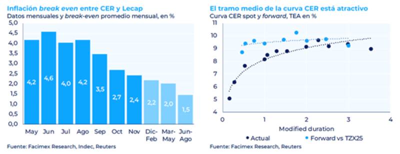 Por otro lado, agregó que "en carteras de retorno total en pesos vemos valor en el tramo medio de la curva CER, con tasas forward altas. La suba estacional de la demanda de dinero amerita bajar tácticamente la duration en CER, mientras que la curva forward estresada invita a concentrar la exposición en el tramo medio, donde destacamos a los Boncer de marzo de 2026 (TZXM6) y noviembre de 2026 (TX26)", dijo.