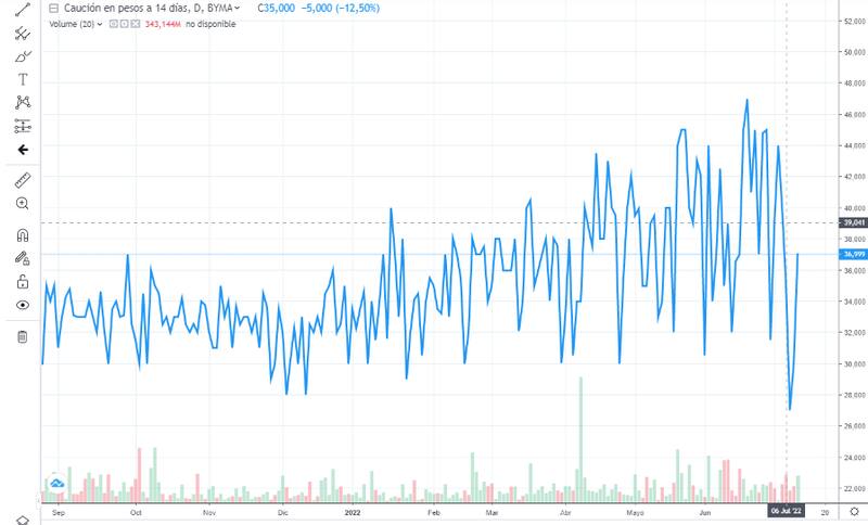 La tasa de caución a 7 días pasó de niveles de 48% a los 20%, para saltar actualmente hasta los 31%. Para el plazo de 14 días, las tasas de caución se hundieron inicialmente al 27% y saltan ahora al 35%.