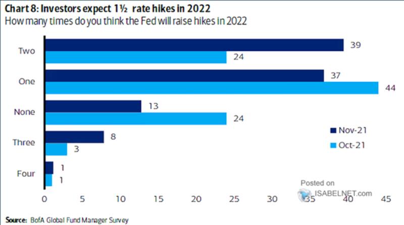 Solo el 13% de los encuestados espera que la Fed no suba su tasa en 2022 mientras que el 8% espera ver tres subas en el próximo año.