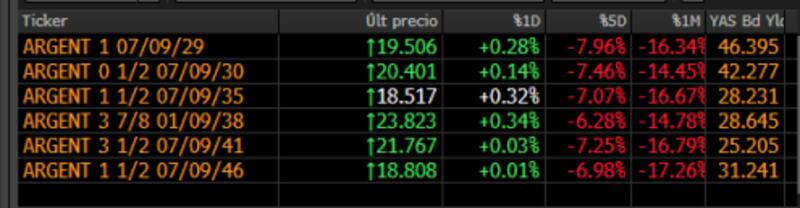 Todos los tramos de la deuda argentina operan con leves subas. El Global 2029 y el Global 2030 ganan 0,28% y 0,14% respectivamente.