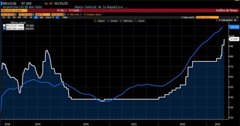 Con esos últimos números, la tasa se ubicaba nuevamente en terreno negativo en términos reales y el BCRA no tuvo otra opción más que subir la tasa de interés de referencia nuevamente. en 600pbs al 97%, lo que representa una TEM del 8,1% y una TEA de 155%.