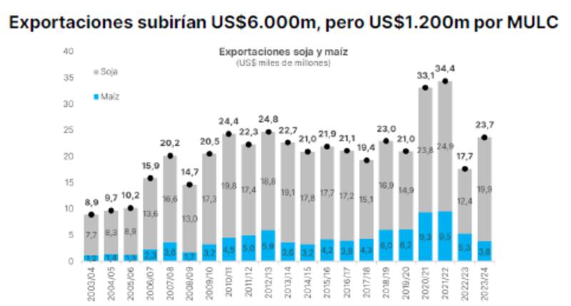 "Con una producción estimada de 50 millones de toneladas para la soja y 42 millones de toneladas para el maíz, proyectamos que las exportaciones de ambos totalizarían u$s 23.700 millones, u$s 6000 millones más que en 2023, aunque dado el blend 80/20% la mejora sería de sólo u$s 1200 millones, ya que u$s 4600 millones se liquidarían por el CCL", estimaron desde PPI.