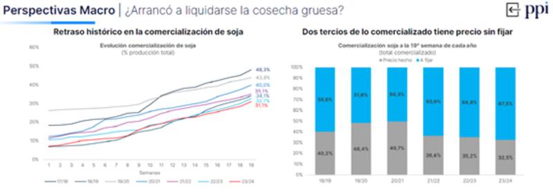 Hasta la primera semana de mayo sólo se comercializó el 31,1% de la producción de soja estimada en 50 millones de toneladas, el nivel más bajo en al menos las últimas siete campañas. Incluso se ubica por debajo de lo comercializado en el mismo período de la campaña 2022/2023", dijeron.