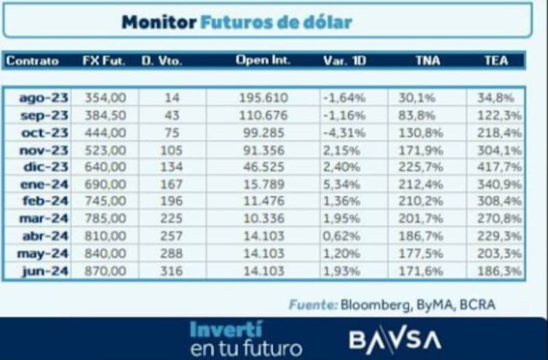 Con la suba de los contratos en el día de ayer, toda la curva de dólar futuro se volvió a desplazar al alza, mostrando una tasa de devaluación implícita de 140% (TEA) para septiembre y más de 300% (TEA) para octubre.