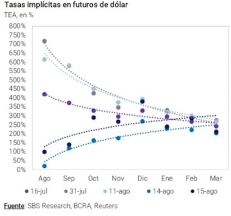 De esta manera, hay una expectativa de devaluación (en términos de tasa efectiva anual) del 122% para septiembre, de 218% para octubre y de casi 420% para diciembre.
