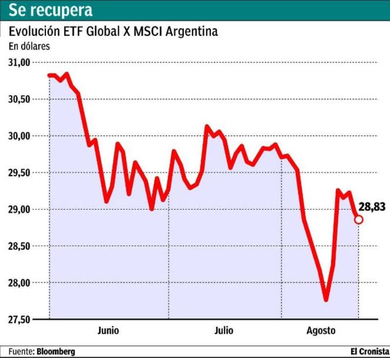 En la previa de las elecciones, la cotización del ETF había caído hasta perforar los u$s 28. El viernes pasado, último día en que operó antes de las PASO, el Global X MSCI Argentina cerró a u$s 28,18. Esta semana, una vez superada la prueba electoral, el instrumento se recuperó hasta la zona de los u$s 29, aunque ayer cerró por debajo de esa marca, en u$s 28,83.