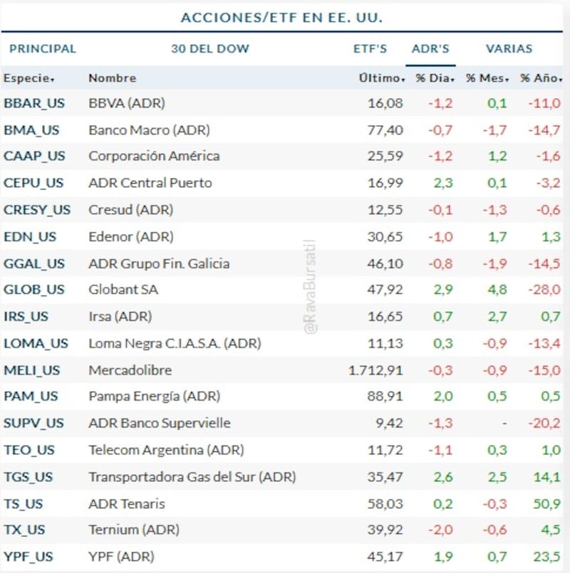 Con mercados que no operan en la Argentina por el feriado del Día del Ex Combatiente Argentino en las Malvinas, los ADR que cotizan en Nueva York evolucionaban en igual medida, a excepción hecha de las energéticas, en donde hubo ganancias de hasta 4% en el caso de TGS, de 2% en Pampa e YPF y de más de 3% en Vista Energía.