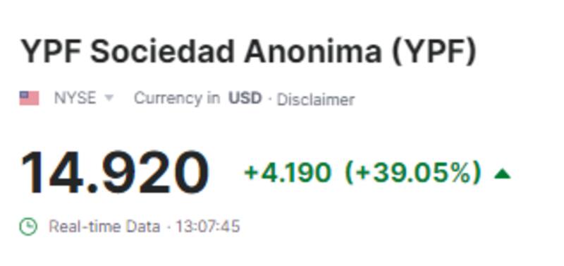 El fuerte avance se debe a las últimas declaraciones llevadas a cabo en la mañana de hoy por el presidente electo, Javier Milei, quien sostuvo que avanzará en la privatización de la petrolera estatal YPF.