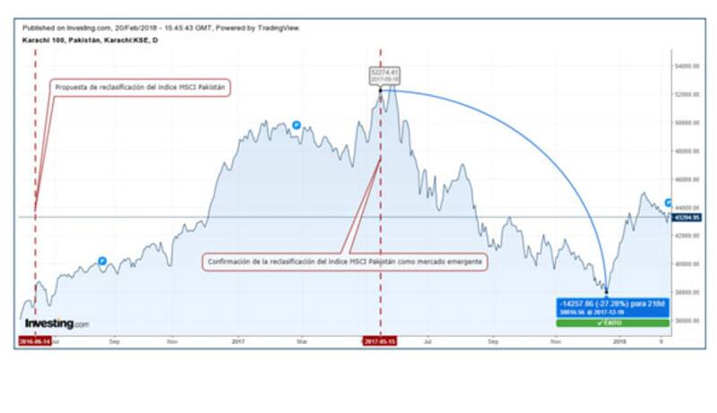 El 14 de junio de 2016 el MSCI anuncia el tratamiento especial del índice de Pakistán y luego en mayo de 2017 confirma su reclasificación a mercado emergente. “Vemos como entre los dos anuncios este índice incrementa un 35,6% su valor. Luego de esta noticia comienza un proceso de ajuste; una vez más, el comportamiento es similar a los dos países anteriores. El índice comienza un proceso de ajuste desde la confirmación hasta finales del 2017 perdiendo un valor del 27% , cierran los analistas de la compañía.