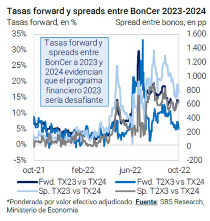 Además, las tasas forward entre papeles CER con vencimiento 2023 y 2024 implican tasas reales muy altas que evidencian que el programa financiero de 2023 será desafiante.