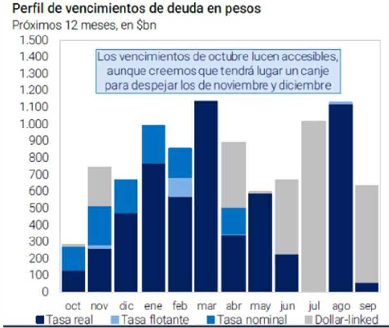 "Consideramos que durante este mes podría tener lugar un nuevo canje de deuda en pesos para títulos con vencimiento en el último bimestre posiblemente a cambio de deuda indexada. Creemos que es necesario mostrar señales concretas de consolidación fiscal para evitar correr el riesgo de que el sector privado deje de renovar los vencimientos en pesos y para incluso poder emitir deuda en pesos a un plazo posterior a 2023", sostuvo.