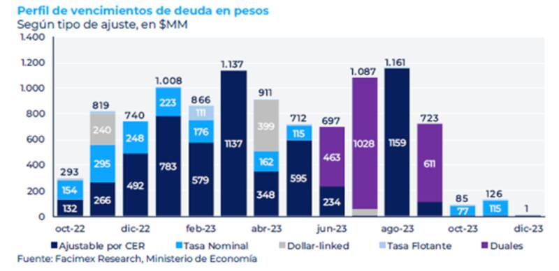 "Los vencimientos de deuda en pesos de 2023 ya ascienden a 5,2% del PBI, con el 98% concentrado antes de octubre y el 88% ligado a deuda que ajusta por tipo de cambio y/o inflación. En este marco, el objetivo reflejado en el Presupuesto de buscar financiamiento neto con deuda nueva por más de 2 puntos del PBI será desafiante, ya que supone una elevada carga sobre la deuda en pesos", dijo Yarde Buller.