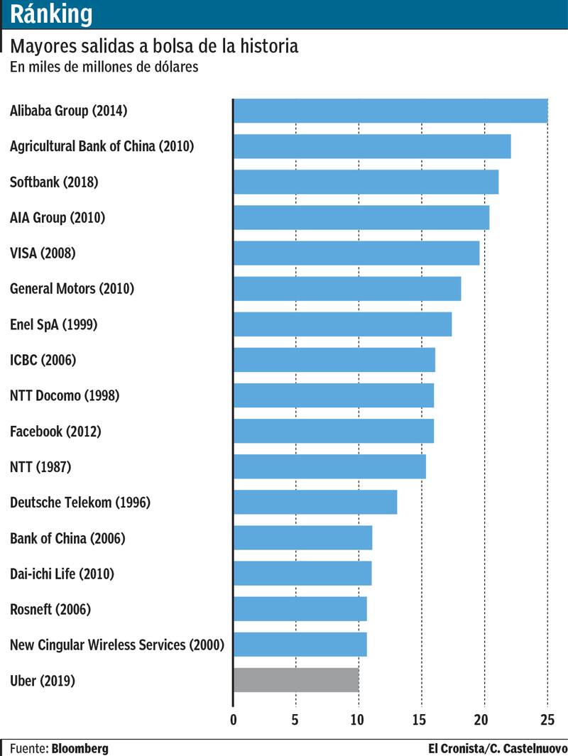 La salida a bolsa de Uber se da en medio de lo que los hombres del mercado llaman un “super ciclo de IPOs, al mismo tiempo que otros gigantes techies de Estados Unidos. La expectativa es que esta colocación supere a la que hizo Facebook en 2012 cuando consiguió levantar u$s 16.000 millones y que quede en segundo lugar después la de la china Alibaba, que en 2014 recaudó u$s 25.000 millones y se convirtió en la IPO más grande de la historia.