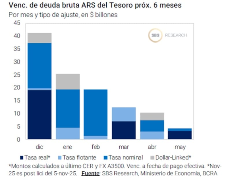 En total, los vencimientos brutos rondan los $40 billones, con una elevada participación del sector público, y aún resta conocer el eventual canje al BCRA para renovar su posición y aliviar los pagos efectivos del Tesoro del 15 de diciembre.