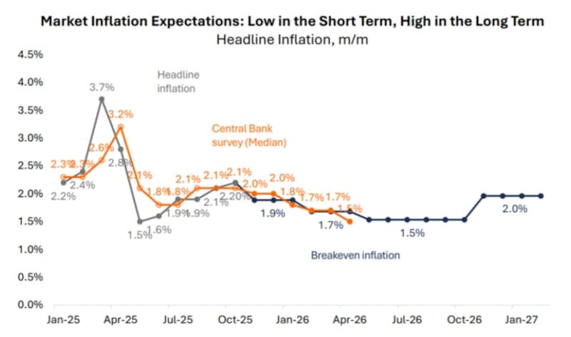 “Su breakeven frente a la tasa fija se ha mantenido en torno al 1,9%, un nivel que consideramos bajo en relación con el consenso para los próximos tres registros de inflación. Un poco más adelante en la curva, también vemos valor en el TZX26, que opera con un breakeven de 1,7%”, dijeron.