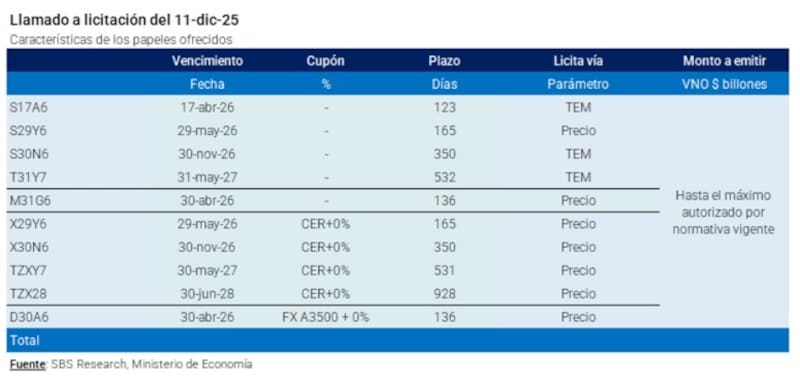 También se incluye una LETAMAR a 9 meses, bonos CER entre 6 y 31 meses, incluyendo nuevas LECER y la primera reapertura exitosa buscada del TZX28 desde su emisión original en marzo de 2024.