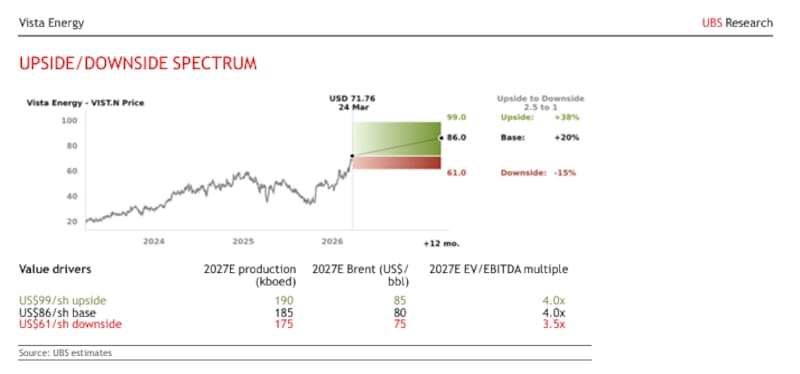 Incluso después del rally reciente, Vista cotiza a alrededor de 3,5 veces EV/EBITDA proyectado para 2027, por debajo de los niveles históricos cercanos a 4 veces que utiliza UBS en su modelo. Esa brecha es la que sustenta el potencial de suba.