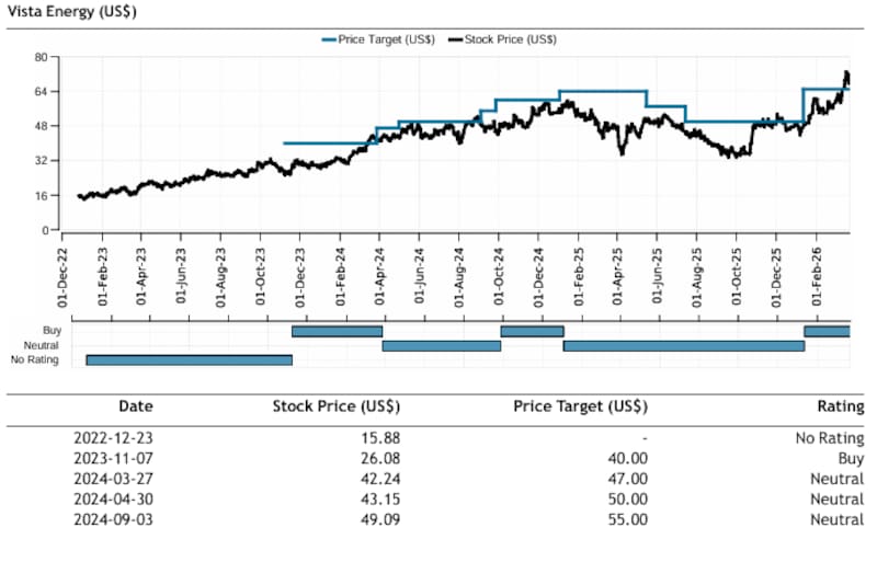 El rally reciente de Vista Energy no agotó la historia. Para UBS, la acción todavía tiene recorrido: elevó su precio objetivo a u$s 86, lo que implica un potencial de suba cercano al 11% desde los niveles actuales en torno a u$s 77.