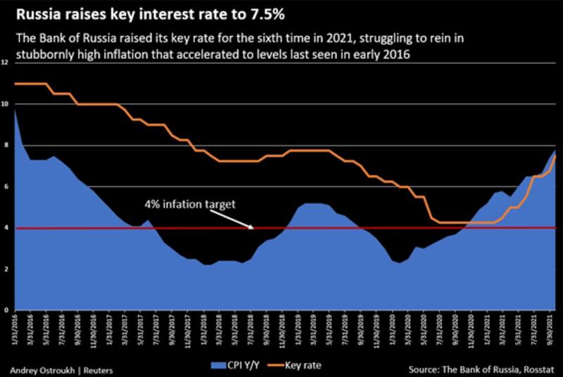 Hace tan solo unos días, el banco central de Rusia elevó su tasa de interés de referencia al 7,5%. Convalidó así la sexta suba de su tasa de política monetaria en lo que va del año. Esto se da en un proceso de alta inflación en Rusia, que se ubica en torno al 7,4% anual.