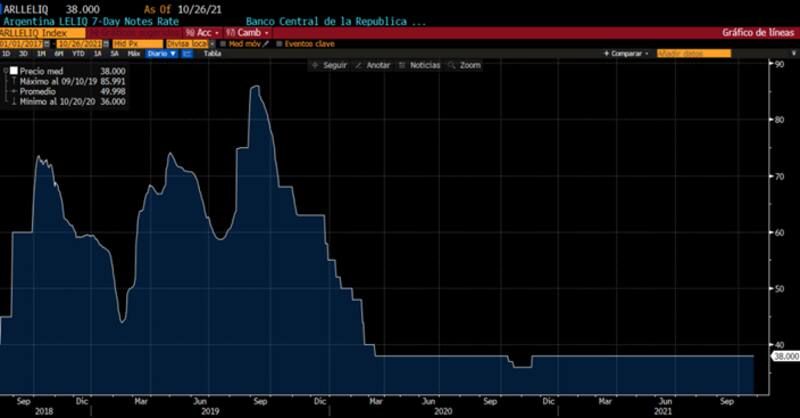 El Banco Central de la República Argentina (BCRA) no está acompañando dicho procesopese a tener la inflación más alta de la región, del 52,5% anual. La tasa de interés de referencia se mantiene planchada y sin cambios, en torno al 38%.