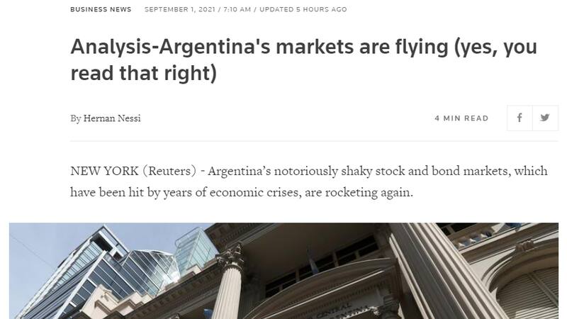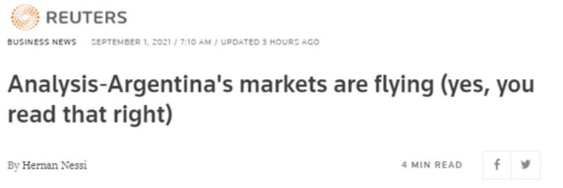 La agenda de noticias global Reuters reflejó la fortaleza del mercado argentino de una manera inusual. En una nota destacaba que las acciones argentinas habían evidenciado una fuerte suba en agosto dijo de modo sarcástico: "Los mercados de Argentina están volando (sí, lo leíste bien)", se refirió Reuters.