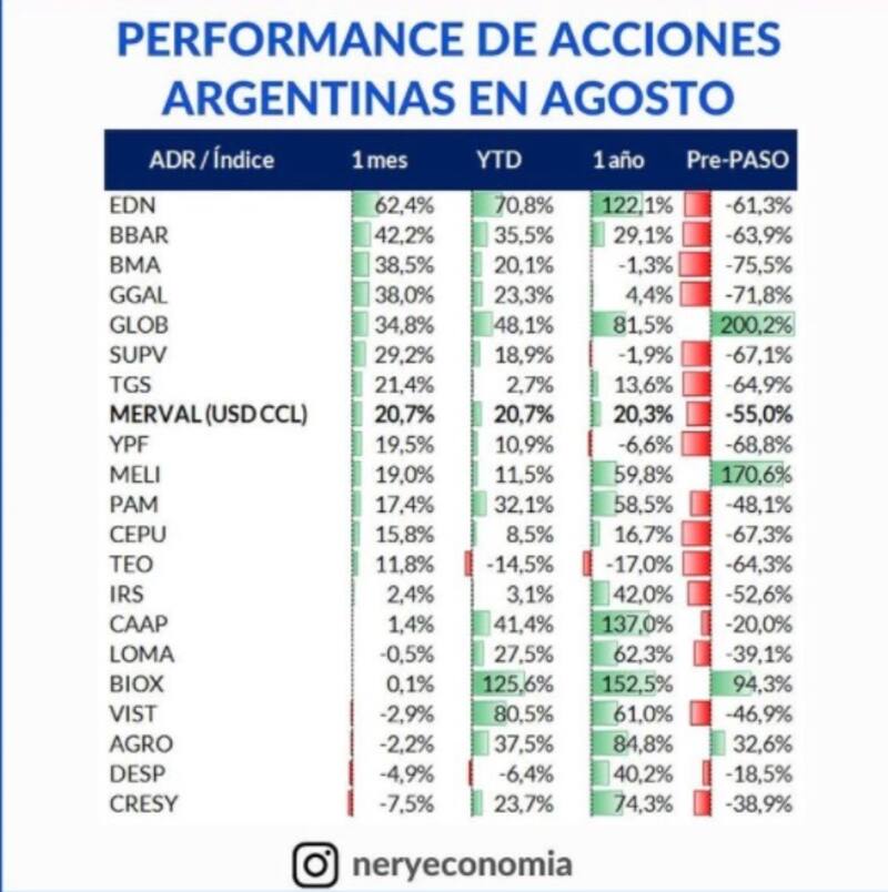 Las acciones argentinas medidas en dólares tuvieron un mes muy bueno en agosto. El Merval en dólares subió un 20,7% el mes pasado. Las acciones que se destacaron fueron Edenor, BBVA Argentina, Banco Macro y Grupo Financiero Galicia que subieron 62,4%, 42,2%, 38,5% y 38% respectivamente.
