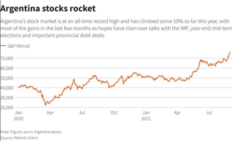 Entre las razones que encontró Reuters para semejante suba, destacan que los activos financieros se vieron impulsados por rumores en torno a un posible acuerdo con el FMI y los avances en las negociaciones para resolver el tema de la deuda con el Fondo, que asciende a u$s 45.000 millones.