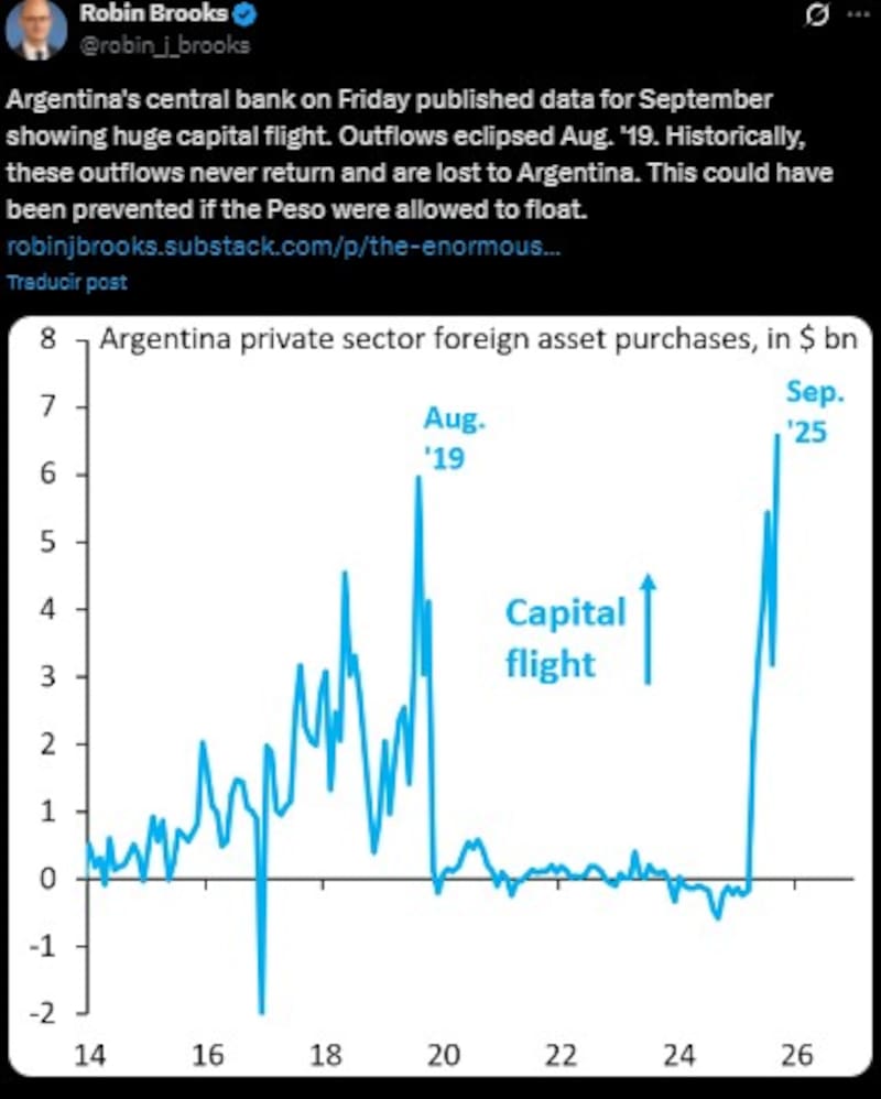 "La fuga de capitales es una consecuencia directa de la decisión de anclar el dólar por razones políticas", sentenció Brooks, agregando que estos fondos que abandonan el país "nunca se revierten" y quedan "perdidos para la Argentina".