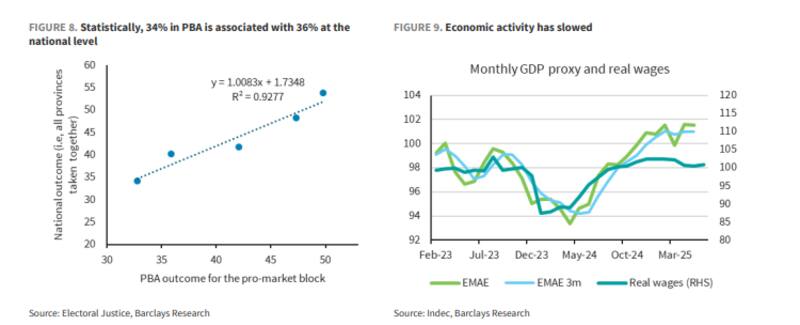 El informe también analiza el efecto de la participación. Aunque fue baja en términos históricos (61%), resultó más alta de lo que se esperaba. Barclays sostuvo que incluso un incremento en la asistencia en octubre -escenario en el que una parte significativa de los nuevos votantes se incline hacia Milei- "difícilmente revierta el cuadro".