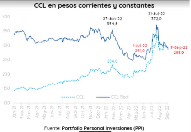 "Estamos casi un 5% del promedio del índice de tipo de cambio real multilateral del año, medido en CCL. Creemos que falta una noticia positiva más para que baje un poco más el CCL y ya empezamos a ver atractivo para dolarizar carteras. En niveles por debajo de $ 275 y cercanos a $ 270, ya vemos valor en el CCL para dolarizar", dijo.