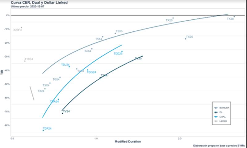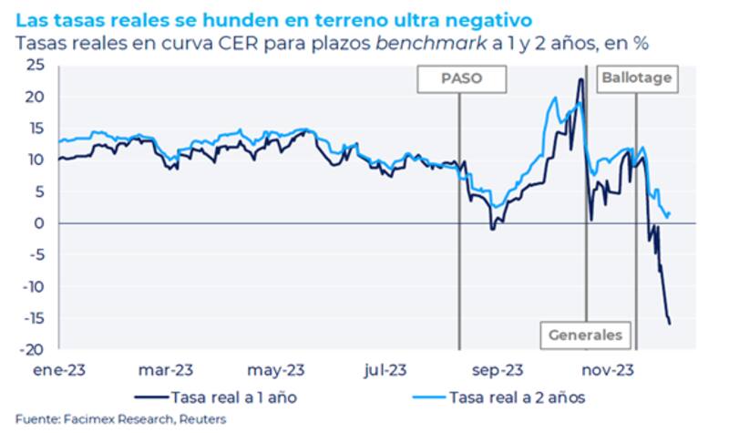 La compresión de spread fue brutal ya que antes de las elecciones generales, las tasas de los bonos CER a un año se ubicaban por encima del 20%, mientras que hoy colapsaron debajo del -15%.