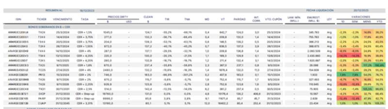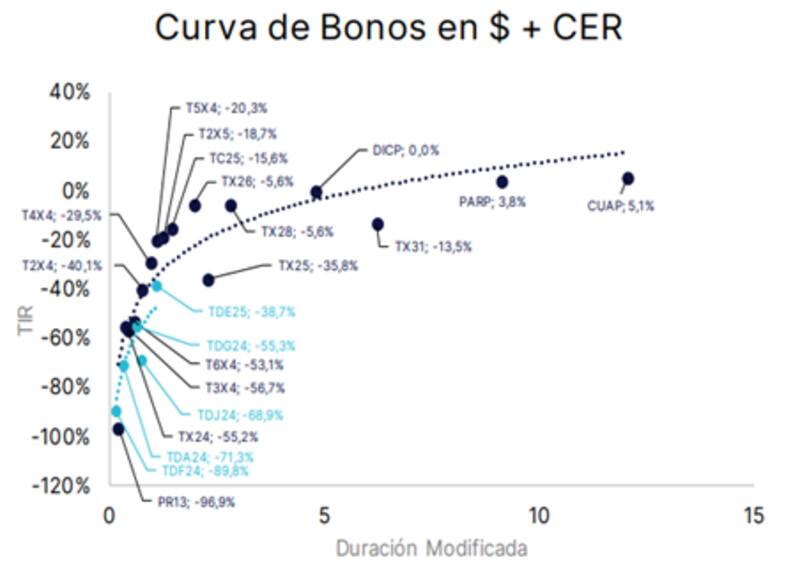 "Consideramos que los ajustes de precios relativos, y la alta inflación esperada para los próximos meses pone alto valor a la deuda CER. En cuanto a duration, el rezago de un mes y medio del índice CER pone más valor a CER con vencimiento en el segundo semestre de 2024, que capturaría una mayor porción de los ajustes de precios relativos", puntualizaron.