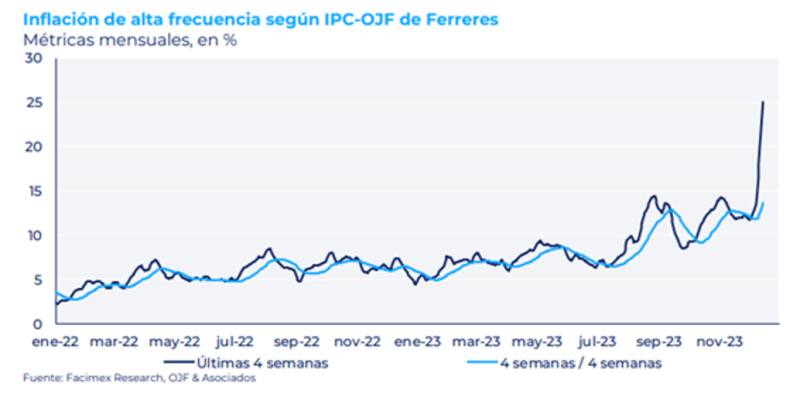 De esta manera, las estimaciones para la primera quincena de diciembre están en el rango 16% a 18%, a la vez que la inflación de los últimos 30 días ya está en 25%.