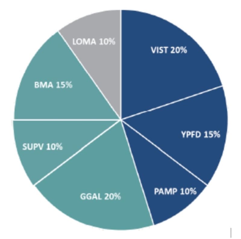 La cartera de acciones recomendadas de Grupo IEB se conforma con un 20% en Galicia, 10% en Supervielle, 15% en banco Macro, 15% en YPF, 10% en Pampa, 20% en Vista y 10% en Loma Negra.