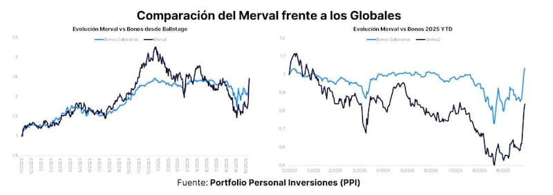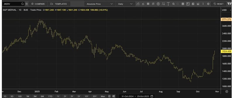 Gracias al avance actual, el S&P Merval en dólares recortó parte de las perdidas que venia acumulando en 2025. Su merma era de más del 35% hasta antes de las elecciones y ahora, el índice local acumula una baja en 2025 del 11%.