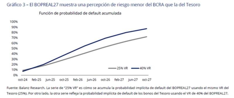 Sobre este mismo punto, los analistas de Balanz afirmaron que el Bopreal 2027 muestra una percepción de riesgo menor del BCRA que la del Tesoro.